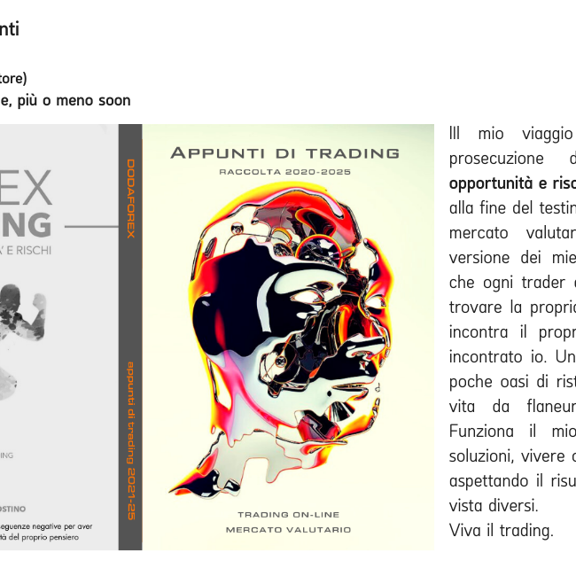 poi ci tornerò su, non è un problrma di fare trading solo sullaprevisione, è quella di seguire un'idea di fondo in cui assume rilevanza la consapevolezza degli aspetti multiformi dell'attività di investimento, come è multiforme l'essenza dell'umano.